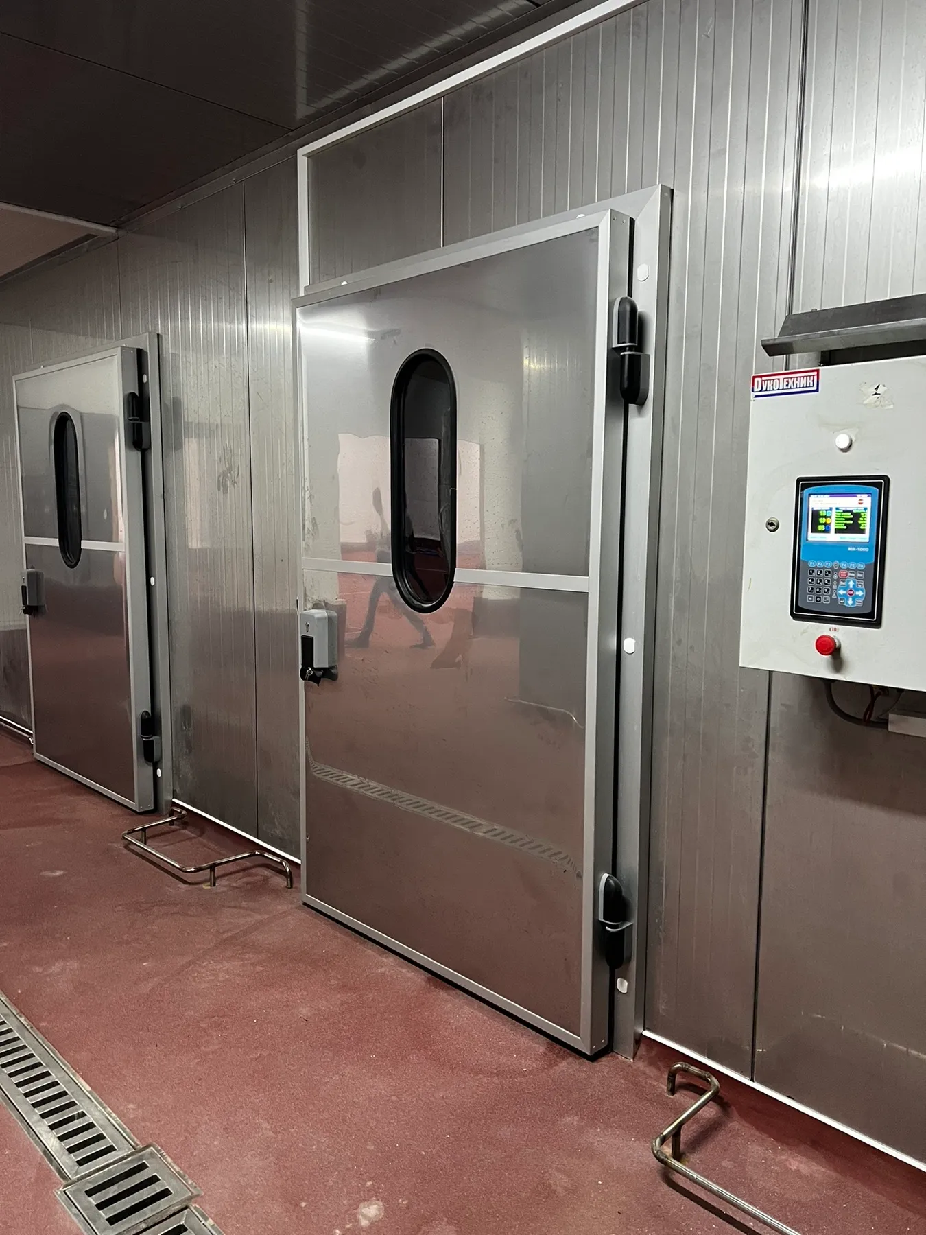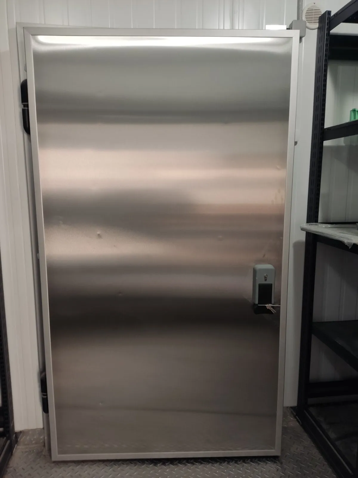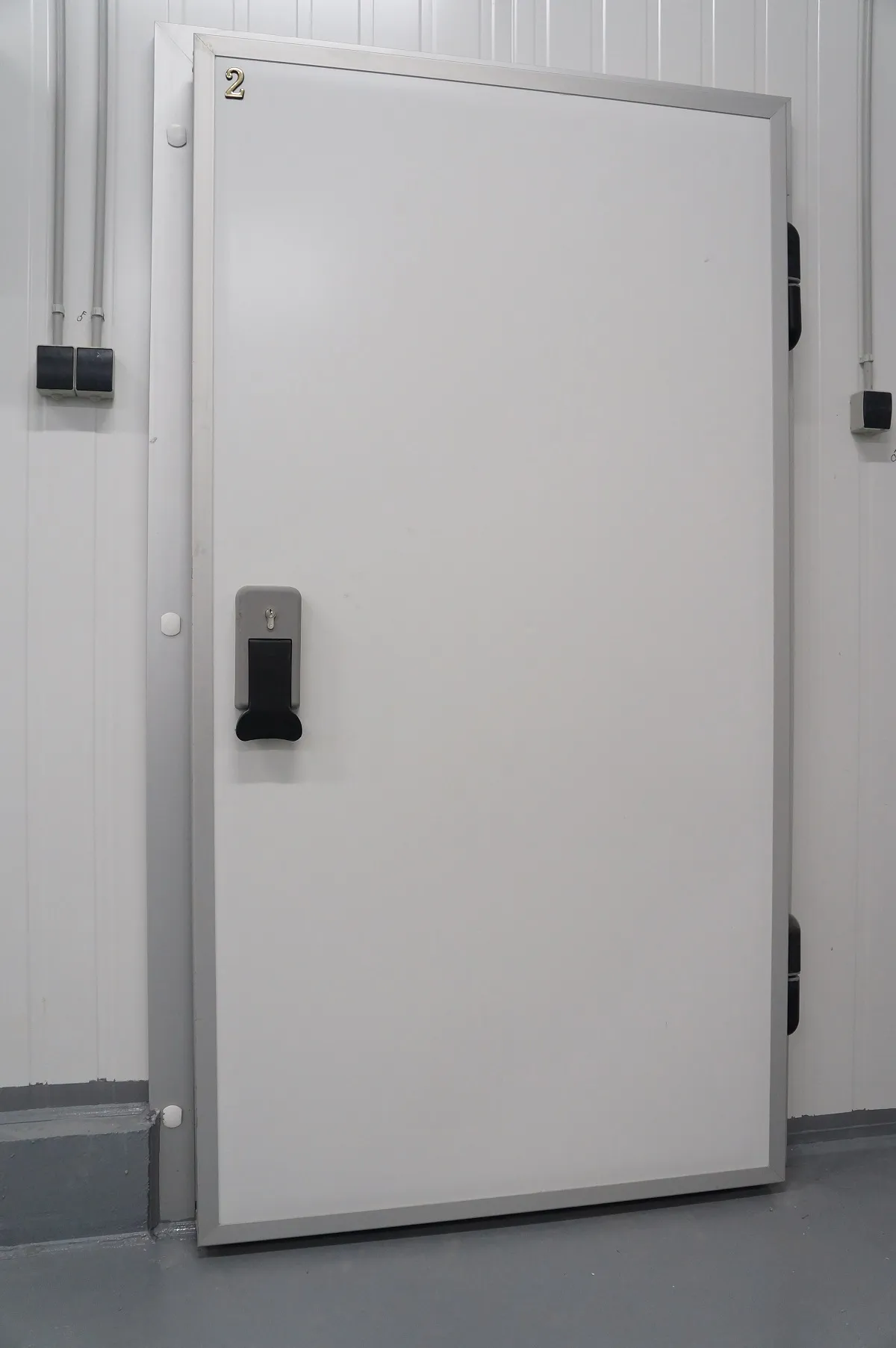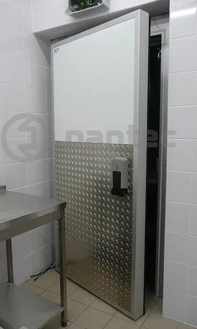 Анодированный алюминиевый профиль, заполненный жестким утеплителем с закладными элементами для крепления фурнитуры. Низкотемпературные двери комплектуются нагревательным кабелем. Для кабеля в дверной коробке предусмотрен канал, который закрывается алюминиевой крышкой. Конструкция дверной коробки обеспечивает легкую и быструю замену кабеля путем снятия алюминиевой крышки, что не требует остановки работы камеры. Специальный уплотнитель с фольгированным защитным покрытием на внутренней стороне дверной коробки обеспечивает плотное прилегание к стене.