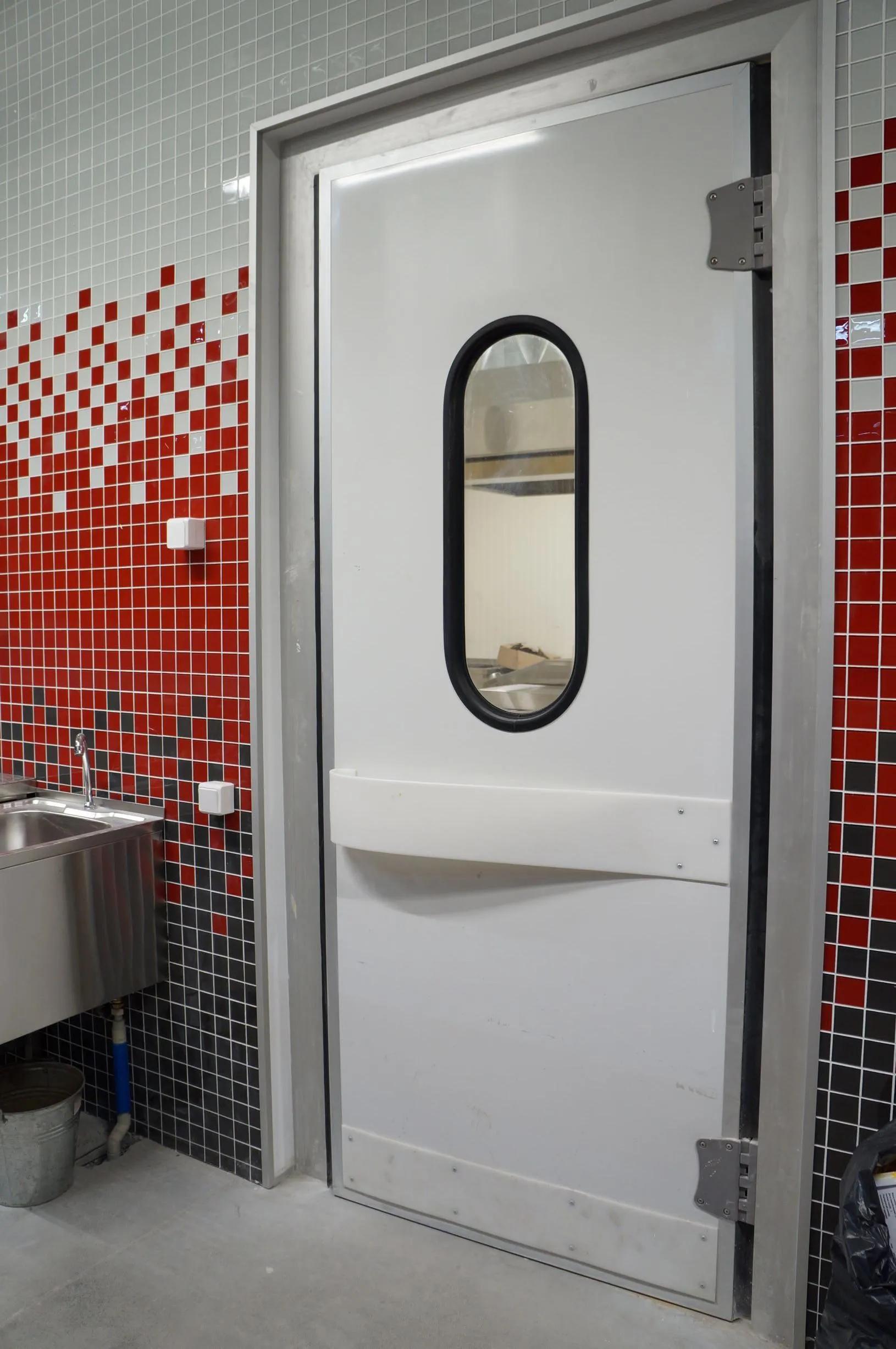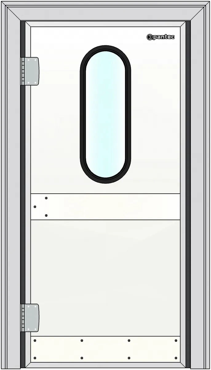 Дверное полотно с закладными элементами, к которым крепится фурнитура, изготавливается как цельнолитое, что исключает клеевые соединения. Полотно обрамлено анодированным алюминиевым профилем, что обеспечивает прочность и долговечность эксплуатации.