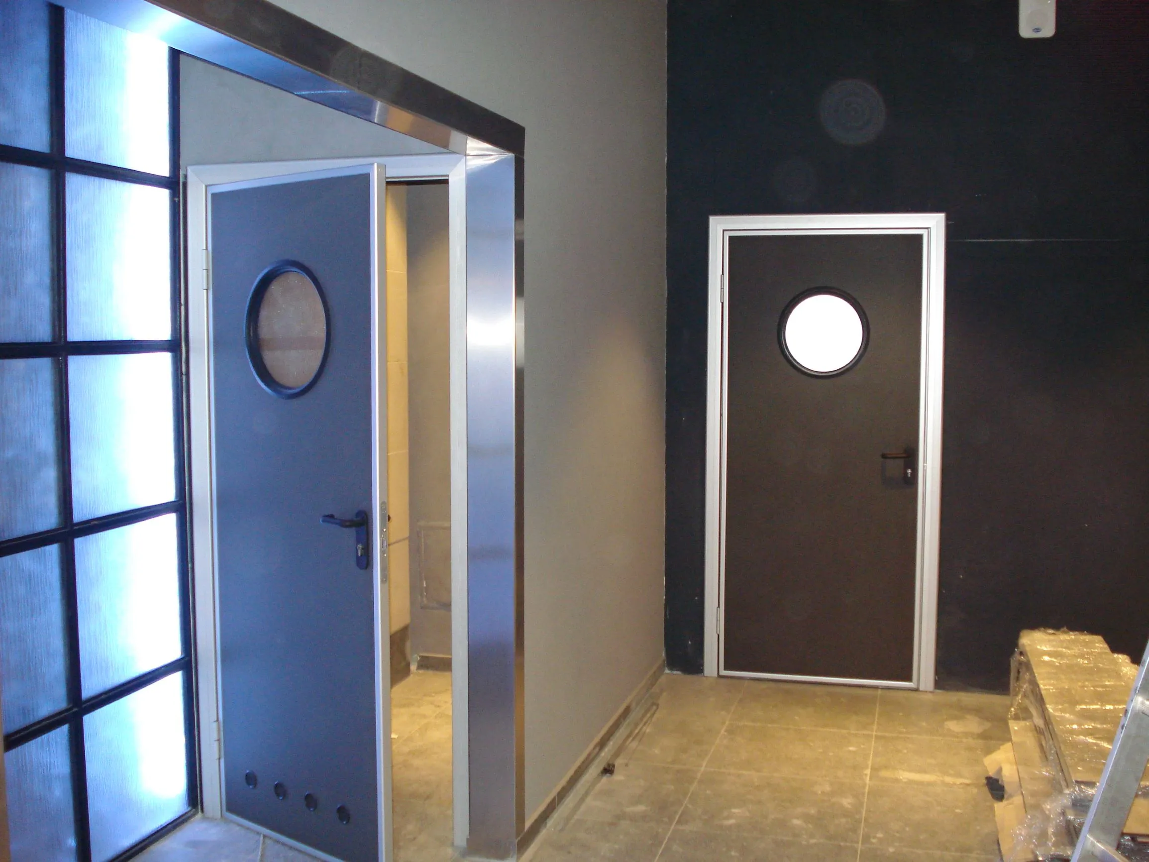 Специальные алюминиевые петли с пластиковыми втулками (Италия). По заказу петли из нержавеющей стали (Италия). Замок с набором ключей. Ручки пластиковые с противопожарными свойствами. По заказу ручки из нержавеющей стали.